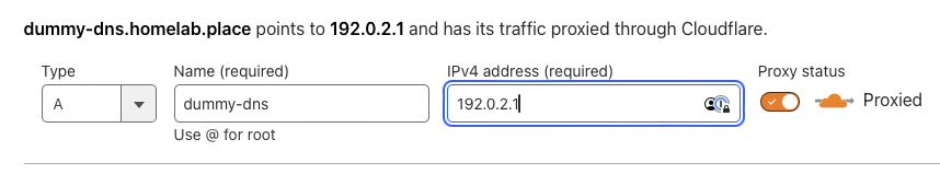 The record created should have the name you want to actually use. The IP Address will be a temporary dummy IP. You do not need to set the Proxy option now, as I will explain later how to have the script do this for you.